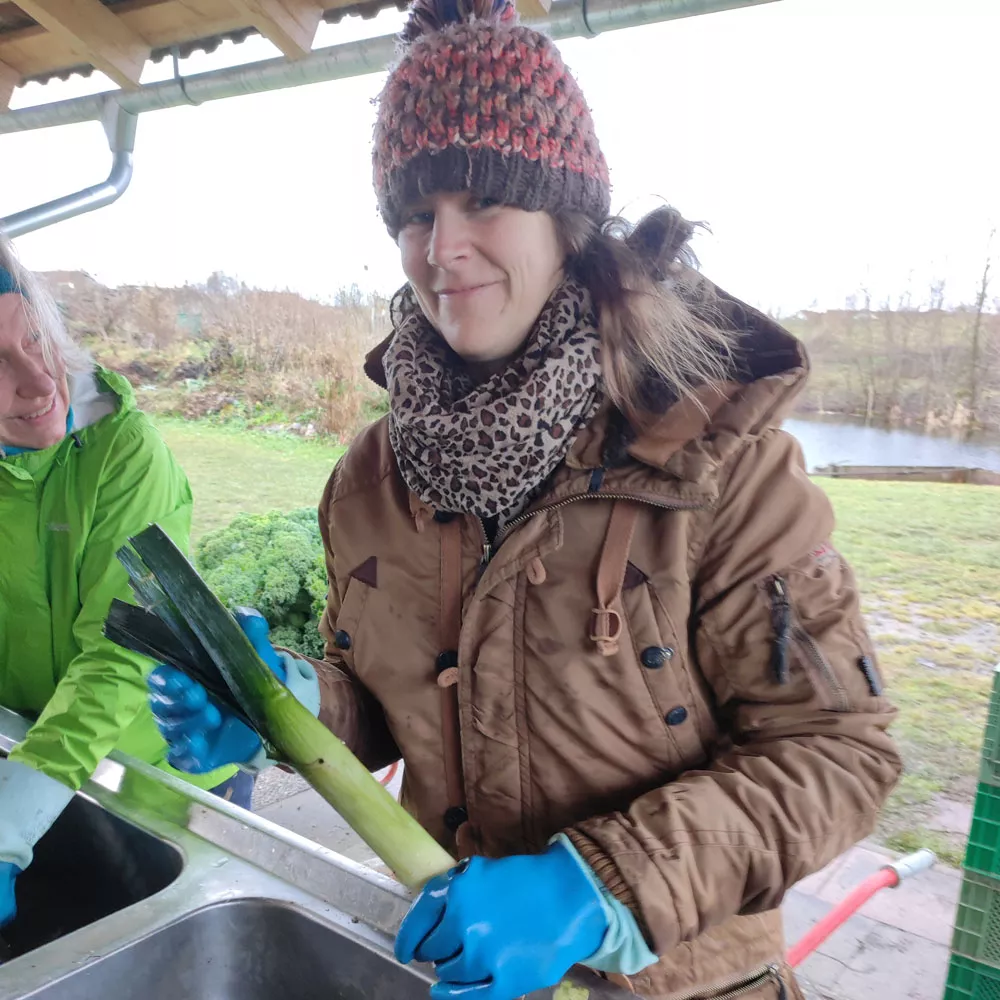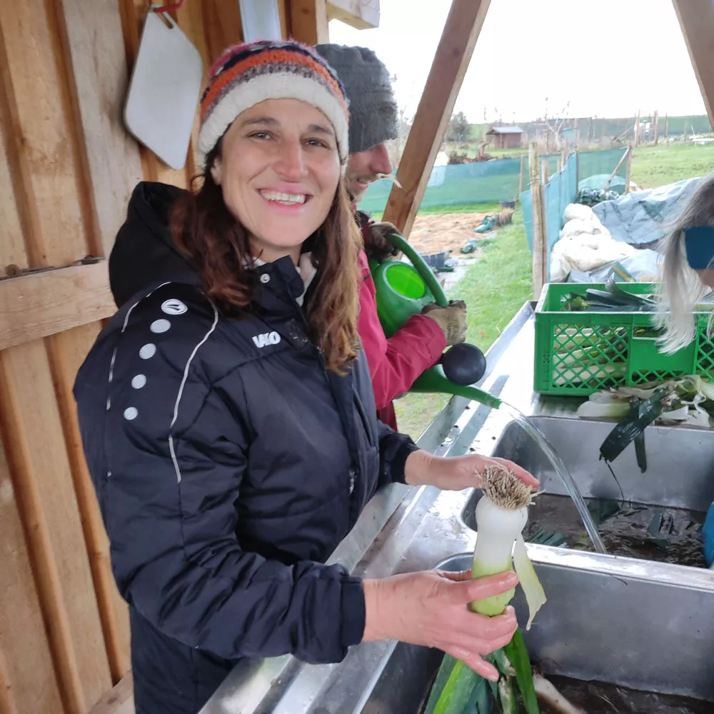 Das Wasser zum Waschen der Kulturen muss mit warmem Wasser aus der Leitung vom Hof unten erwärmt werden, damit wir es trotz Gummihandschuhen einigermaßen hinbekommen das Gemüse zu reinigen.