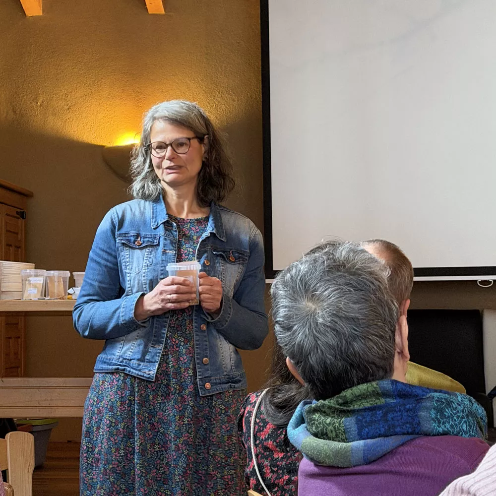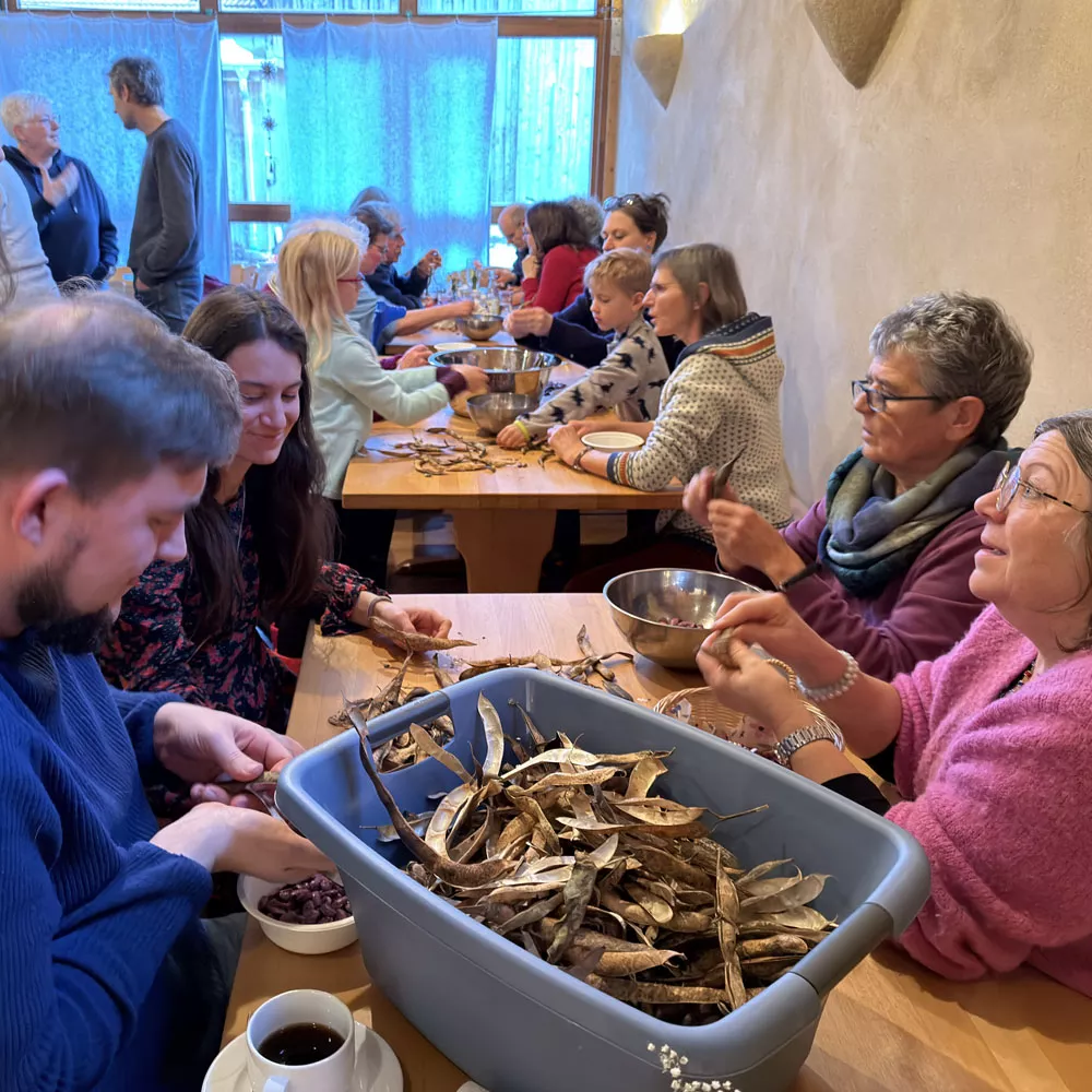 Mit Live-Musik von unseren SoLaWi-Musikern und köstlichem Kaffee und Kuchen haben wir bei angeregter Unterhaltung Saatgut gepult und in Tütchen verpackt.